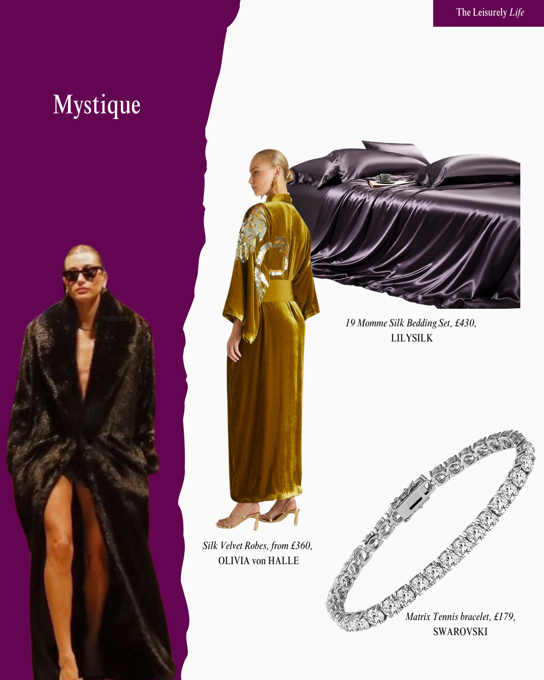 For the woman wrapped in allure and intrigue, her presence is as opulent as the treasures she surrounds herself with. The 19 Momme Silk Bedding Set (£430, LilySilk) envelops her in sensual luxury, a nightly retreat into sophistication. The Silk Velvet Robe (from £360, Olivia von Halle) is both dramatic and regal, embodying her enigmatic charm. Adorn her wrist with the Matrix Tennis Bracelet (£179, Swarovski), a sparkling testament to her timeless elegance and subtle magnetism.